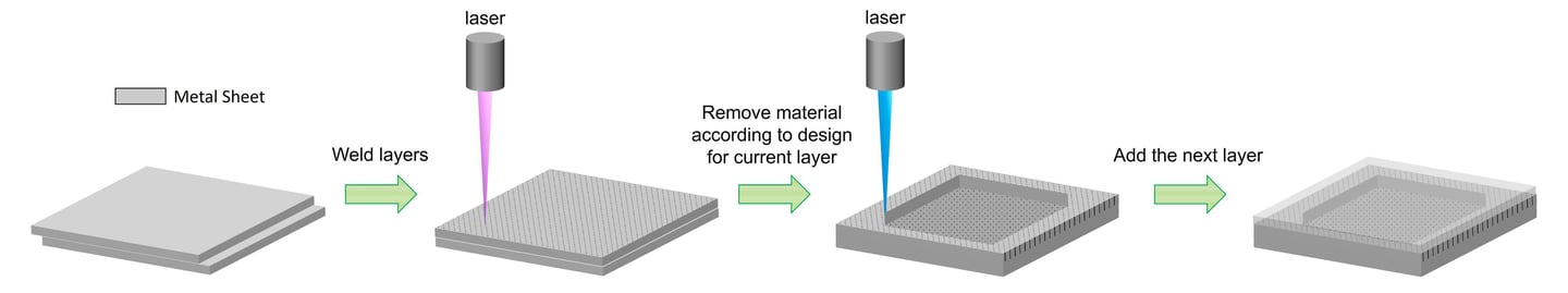 A laser welds through the sheet, bonding it firmly to the build plate.